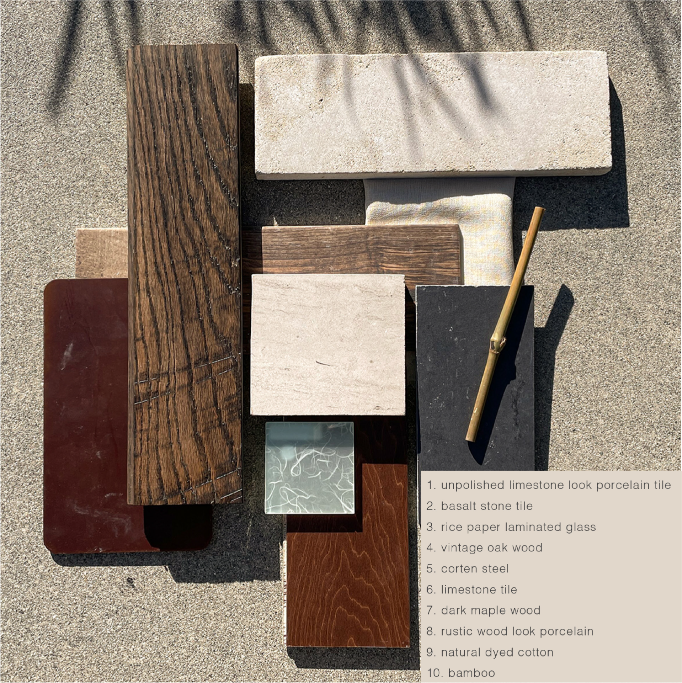 These selections reinforce a tactile and calming atmosphere, connecting the architecture to landscape, food, and wellness.